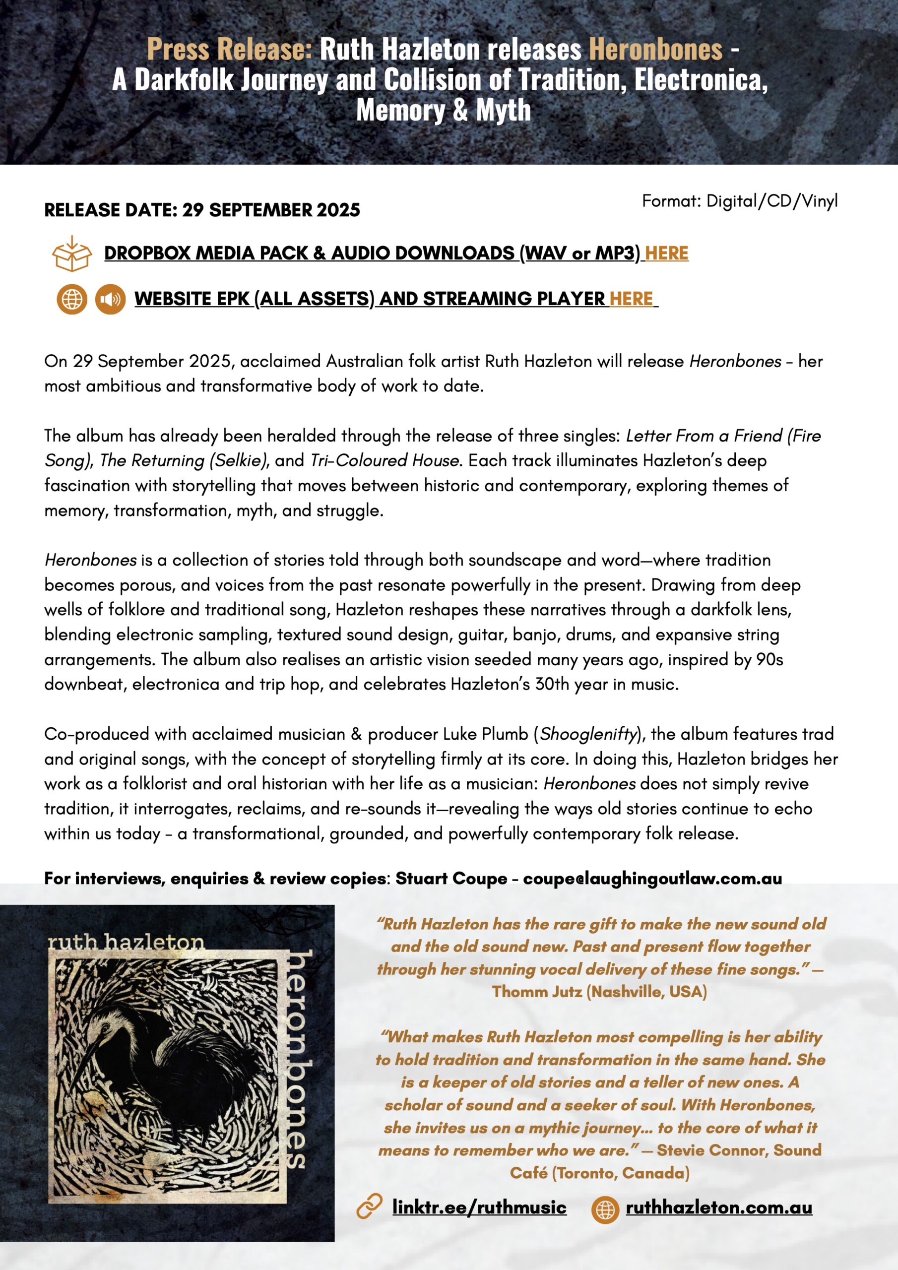“What makes Ruth Hazleton most compelling is her ability to hold tradition and transformation in the same hand. She is a keeper of old stories and a teller of new ones. A scholar of sound and a seeker of soul. With Heronbones, she invites us on a mythic journey… to the core of what it means to remember who we are.” — Stevie Connor, Sound Café (Toronto, Canada)